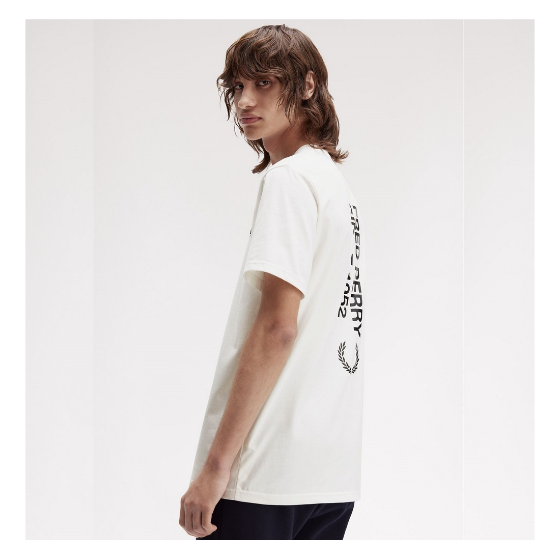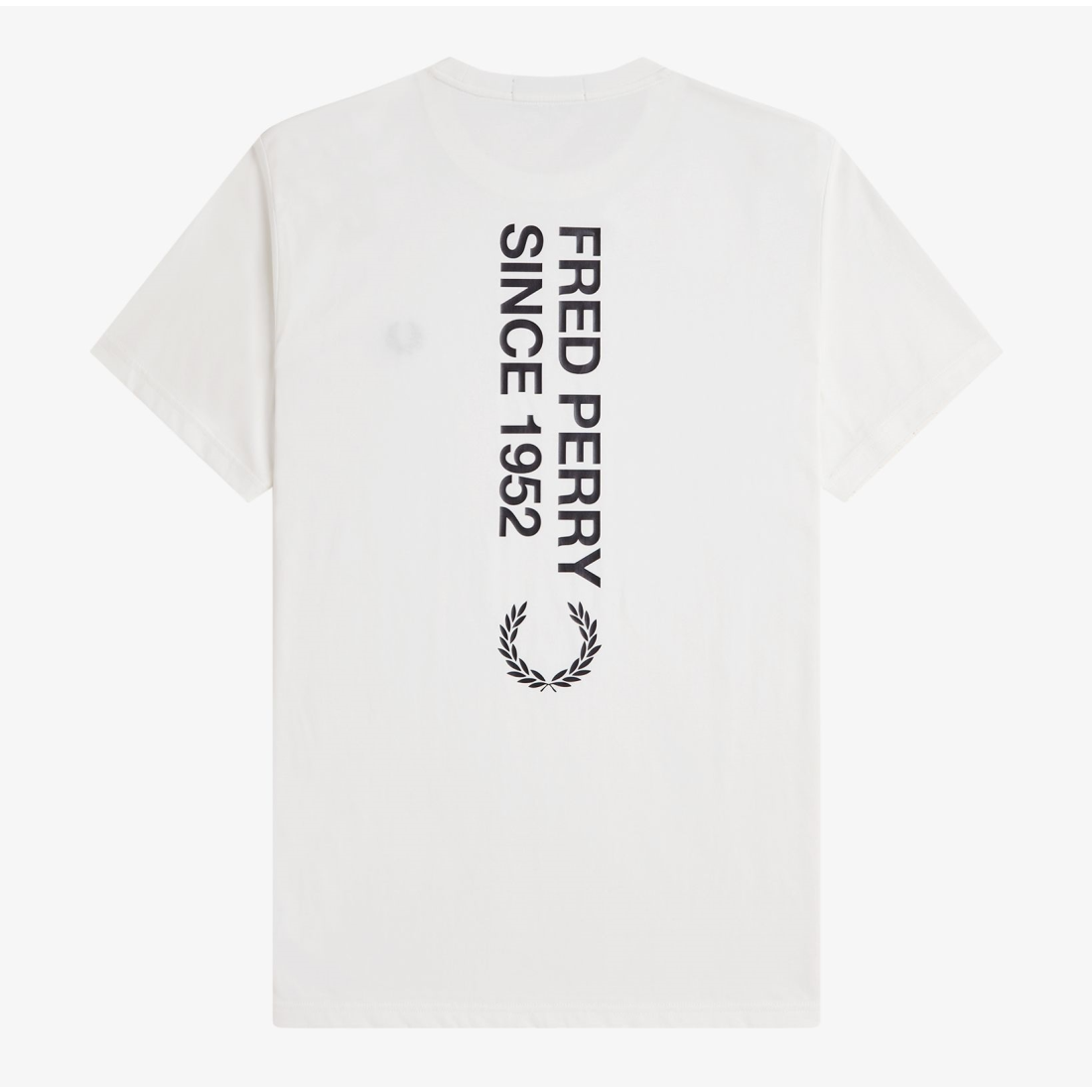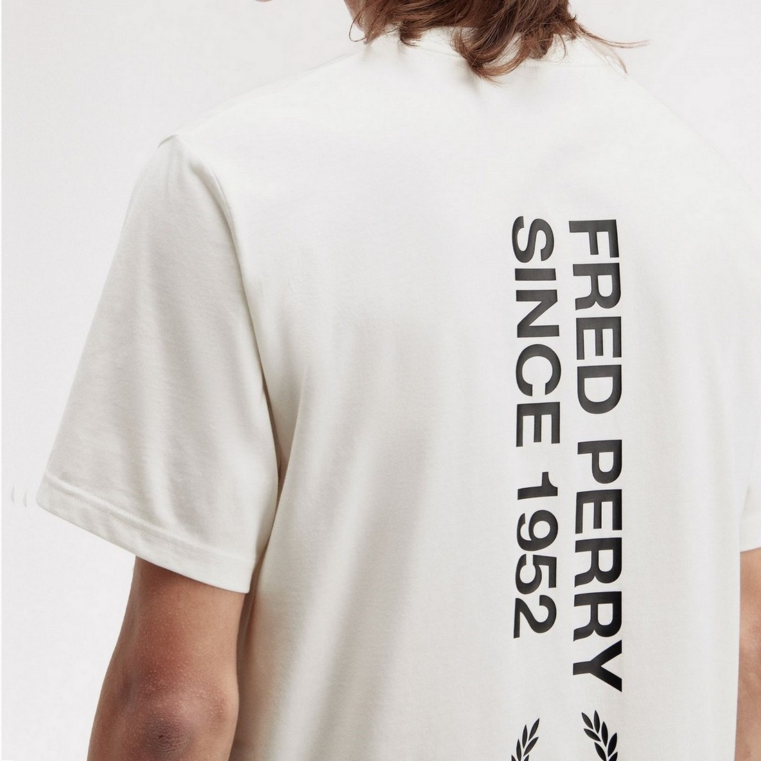 Camiseta Fred Perry de cuello redondo con logotipo grande de la marca estampado en la espalda.