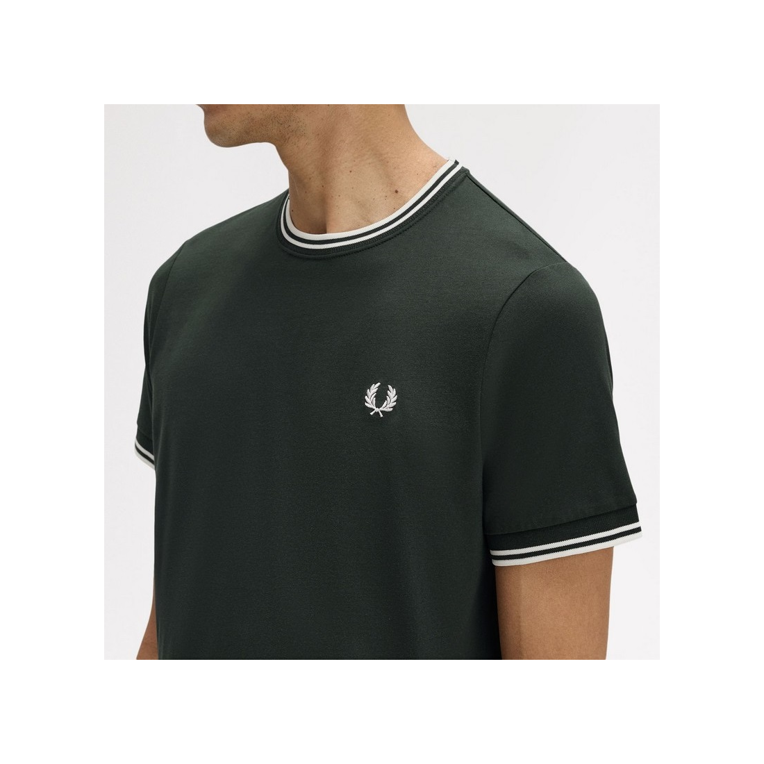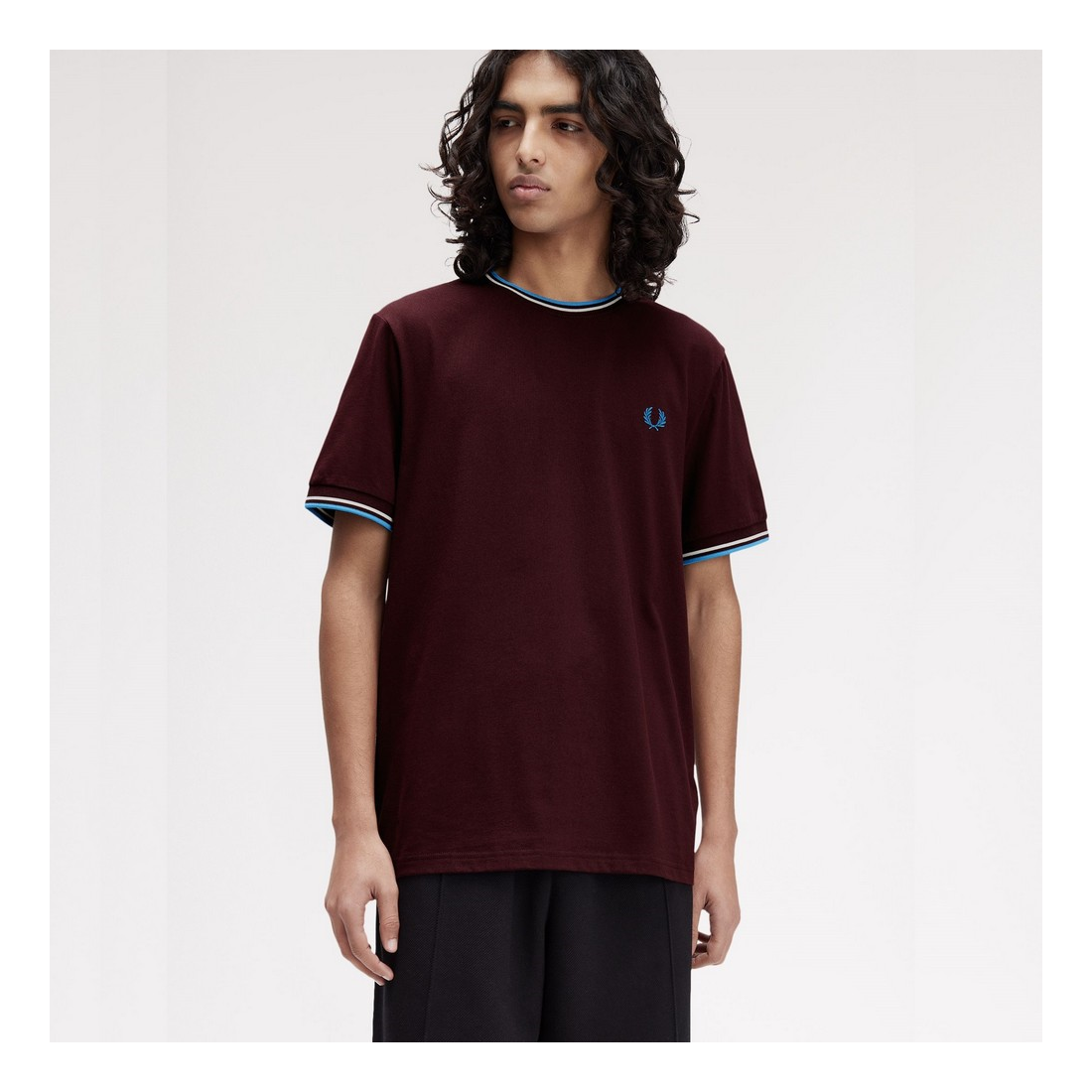 Camiseta Fred Perry de corte standard confeccionada en punto de algodón en cuello redondo. Ribete dos franjas en el cuello y el borde de las mangas.