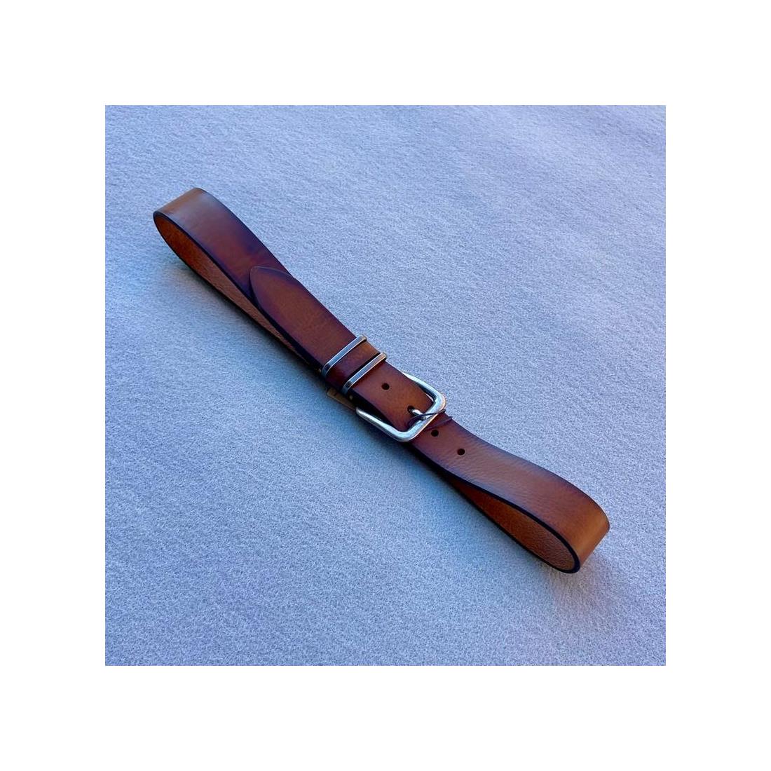 Cinturón en piel vacuno al corte tamponado a mano para conseguir un look vintage. Lleva hebilla metálica en acabado níquel viejo.
