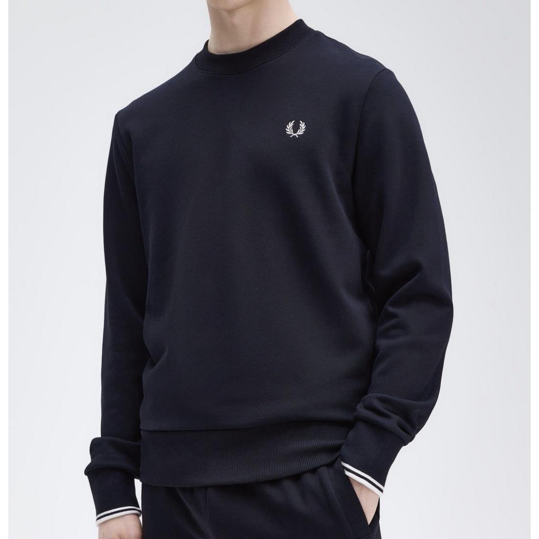 Sudadera Fred Perry de cuello redondo con ribetes de canalé y dos franjas en los bordes de las mangas. Un básico que debes tener.