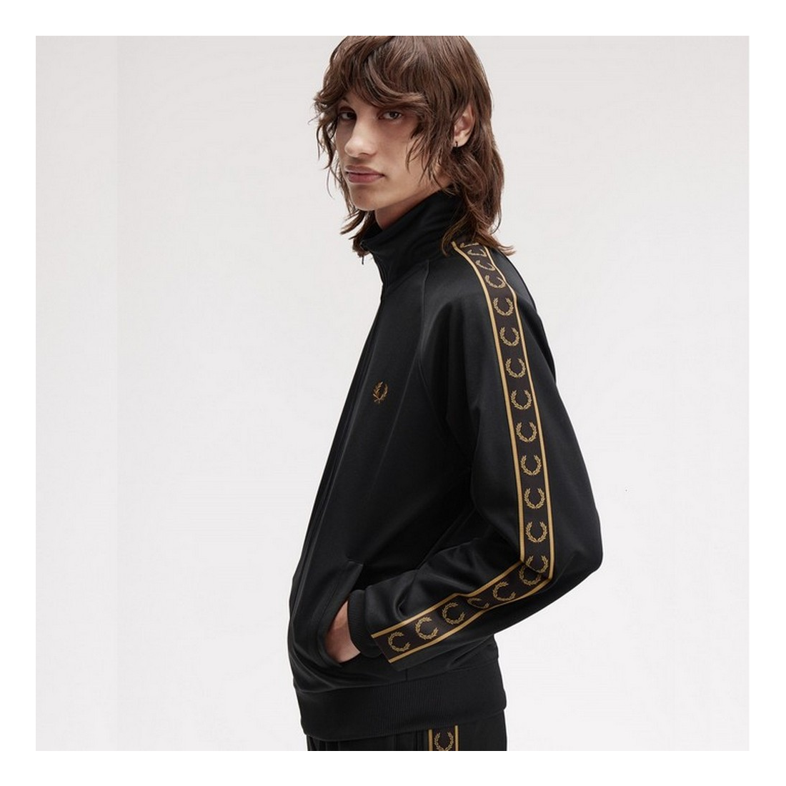 Chaqueta chandal Fred Perry confeccionada en tejido tricot con cinta a contraste con el logpo en los hombros y las mangas.